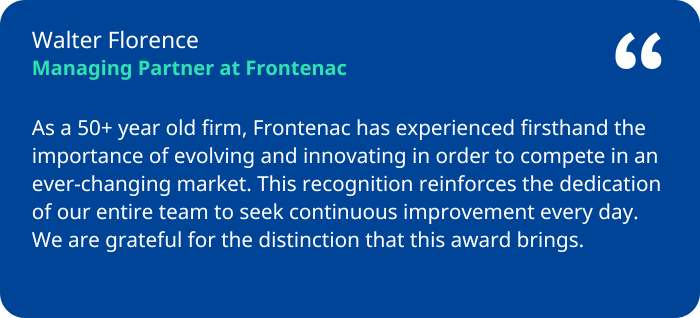BluWave’s “Top 50 Private Equity Innovator” award is a program designed by BluWave consulting firm to recognize what it considers to be the top 2% of private equity firms for proactive due diligence practices, transformative value creation, modern private equity firm operations and corporate citizenship. Recipients were selected based on consultation with limited partners, investment bankers and others in the private equity industry. The award is based on BluWave’s review of the more than 6,000 private equity firms in the U.S. and Canada from which 69 private equity firms were selected as award recipients in 2023, 82 private equity firms were selected as award recipients in 2024 and 103 were selected as award recipients in 2025. BluWave, LP has not received investment capital from and holds no ownership interest in the private equity firms evaluated or recognized under the PE Innovator awards program. Frontenac did not pay a fee to receive this award but is a client of BluWave. This award is not to be construed as indicative of Frontenac’s future performance. Reference to an award is only one piece of information relevant to an evaluation of an investment adviser such as Frontenac and additional factors are available. Finally, this award represents information as of a specific date and time and may not reflect important information related to an evaluation of the investment adviser which has occurred prior to, or subsequent to, the award. Frontenac is not affiliated with BluWave. Frontenac received this award in 2023, 2024, and 2025