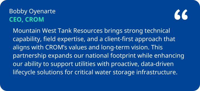 “Joining the CROM family allows us to scale our impact while remaining true to the hands-on, responsive service our clients rely on,” said Tom Quammen, Vice President and General Manager of Mountain West Tank Resources. “Together, we can provide utilities with clearer insight into asset condition, better planning tools, and more comprehensive support throughout the life of their infrastructure.”